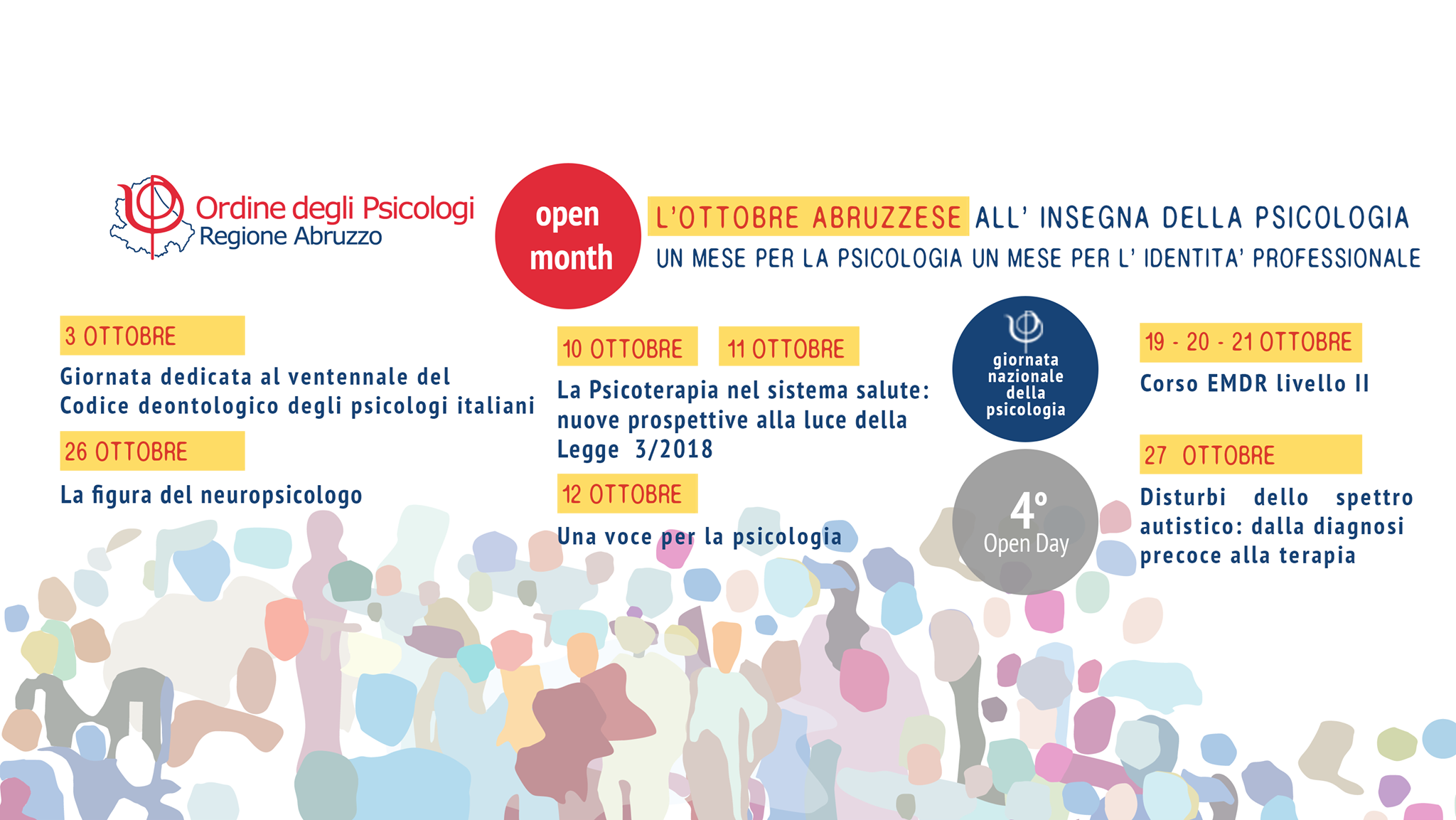 Dopo l'esperienza degli Open Day della Psicologia, quest'anno l'Ordine degli Psicologi della Regione Abruzzo presieduto dal Dott.Tancredi Di Iullo, ha pensato di estendere ad un mese intero il tempo dedicato alla Psicologia. Saranno divulgati gli elementi che contribuiscono a rendere efficace l’intervento psicologico nei diversi contesti di declinazione e che hanno portato all'approvazione della Legge 3/2018, la cosiddetta Legge Lorenzin, che ha transitato definitivamente la Psicologia tra le Professioni del sistema Salute.
