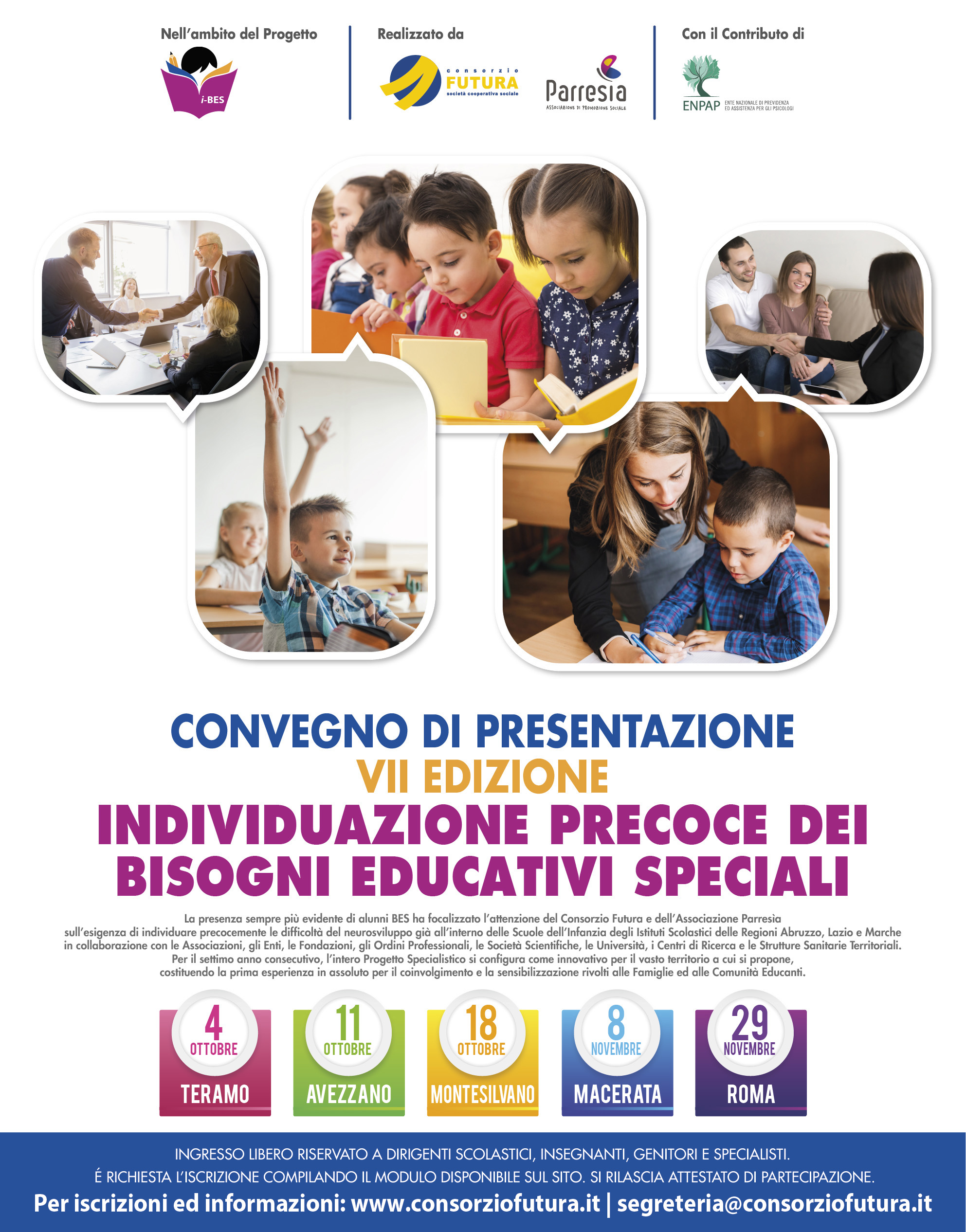 Consorzio Futura e Associazione di Promozione Sociale "Parresìa" sono liete di realizzare la VII Edizione del Progetto Specialistico "i-BES" (Individuazione Precoce dei Bisogni Educativi Speciali) negli Istituti Scolastici - Scuole dell'Infanzia.