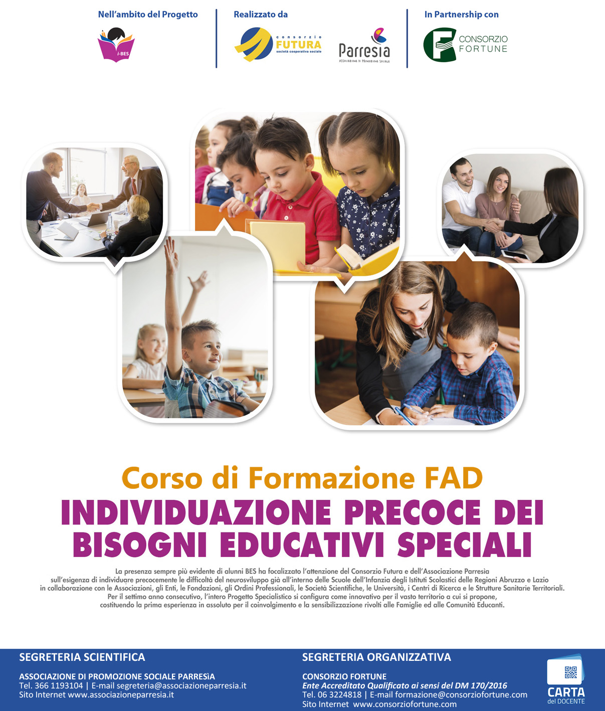 Il Corso di Formazione FAD "Individuazione Precoce dei Bisogni Educativi Speciali" permetterà di conoscere il Progetto Specialistico “i-BES” che Consorzio Futura e Associazione Parresìa realizzano, per il settimo anno consecutivo, negli Istituti Comprensivi attraverso interventi territoriali di diagnosi precoci, interventi multidisciplinari, sostegno alle famiglie, formazione della comunità educante, ricerca e divulgazione scientifica per favorire l’inclusione ed il benessere scolastico.